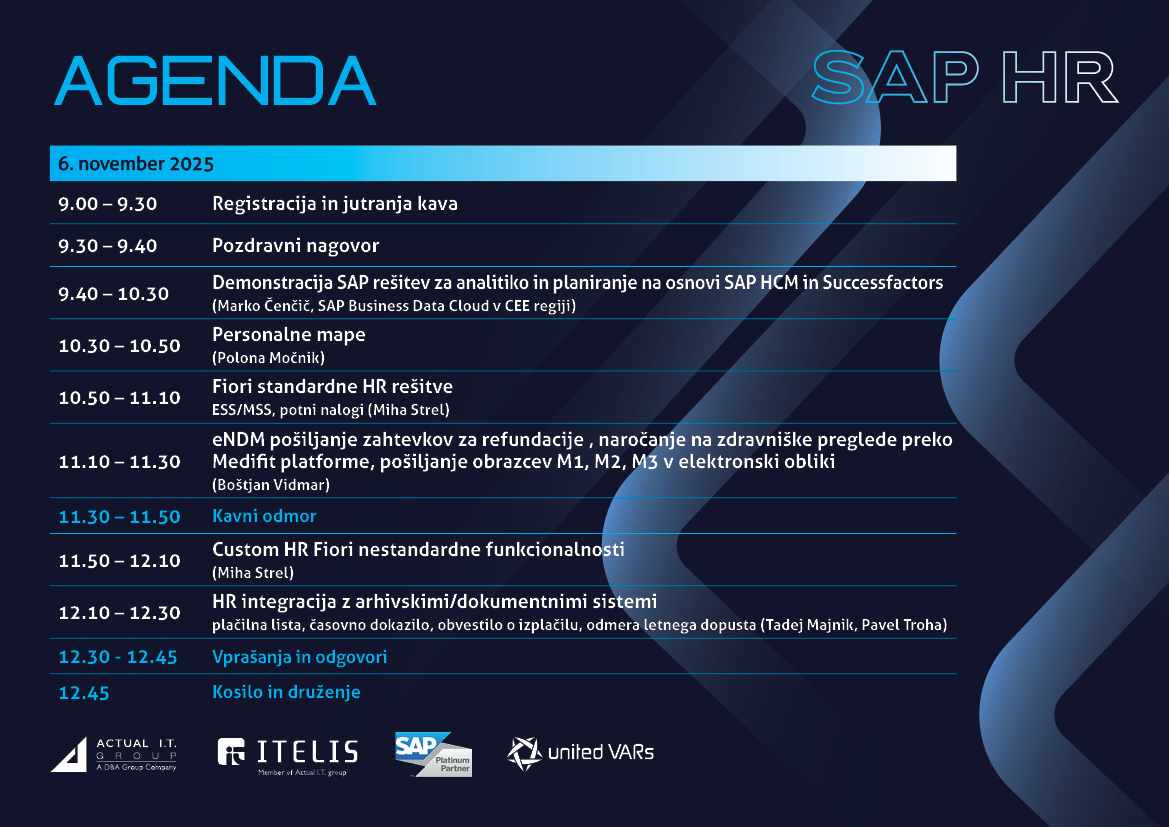 Zato vas vabimo na strokovni dogodek, kjer bomo predstavili, kako lahko s pomočjo SAP HR rešitev optimizirate, avtomatizirate in povezujete kadrovske postopke – od dokumentacije do refundacij, od zdravniških pregledov do potnih nalogov.